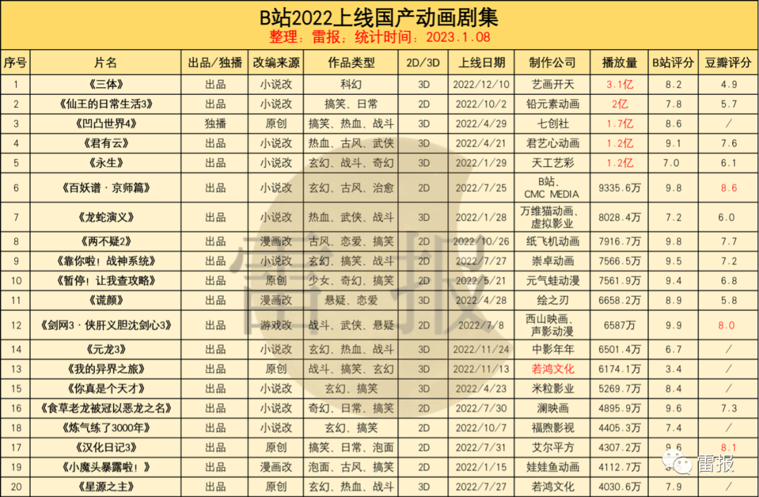 此外,按“播放量”进行从高到低排序的表格,播放量前5依次为《三体》、《仙王的日常生活3》、《凹凸世界4》、《君有云》,以及《永生》,播放量分别为3.1亿、2亿、1.7亿、1.2亿、1.2亿(1.8统计,人工统计存在误差)。这几部作品也是表格中唯五去年在B站开播的,实现播放量过亿的国产动画剧集。(截至1月8日)