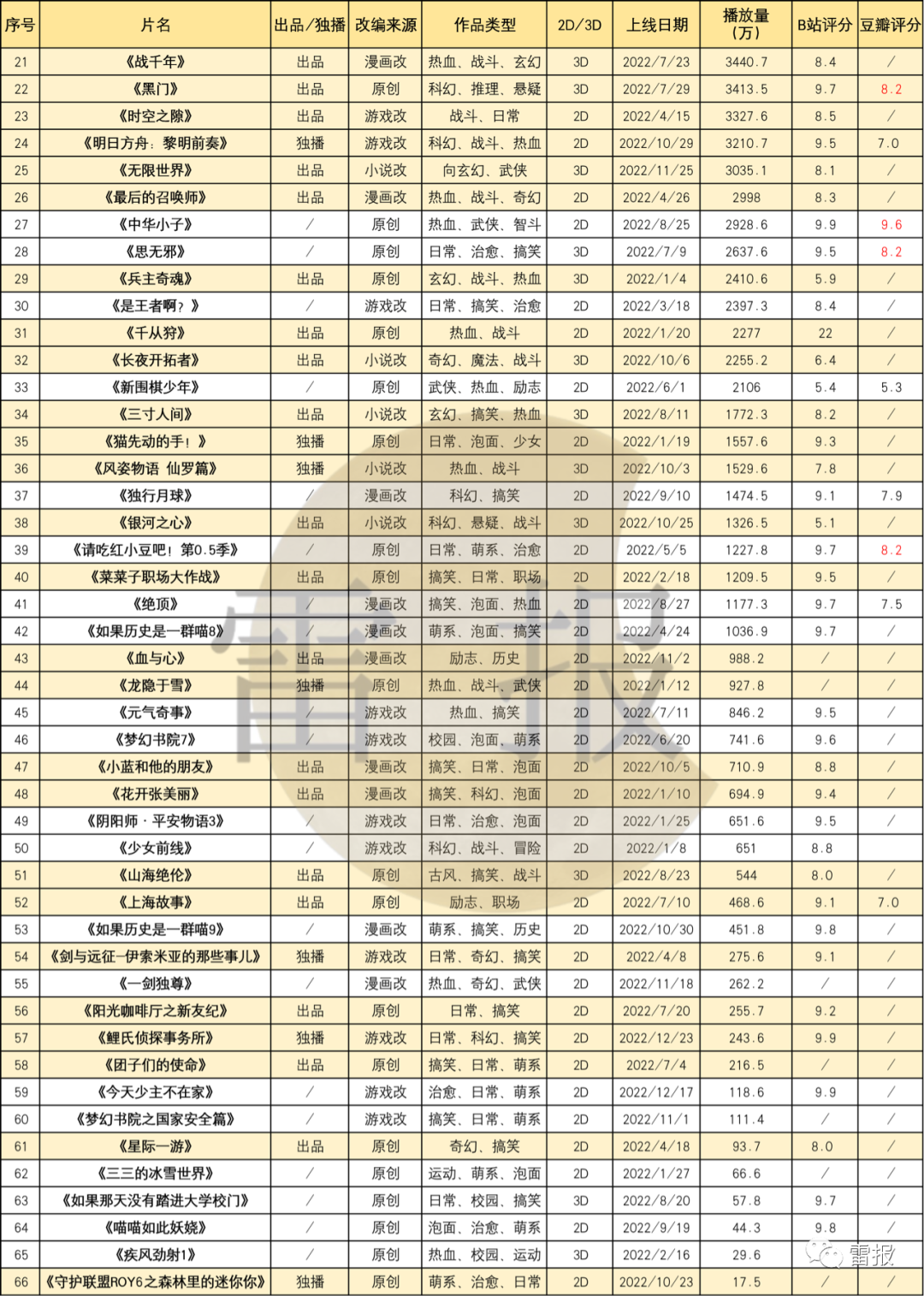 总体来看,66部动画中,B站参与出品了38部,占比近6成;“动画呈现方式”上,66部动画中,2D作品44部,整体占比超6成,3D的有22部。