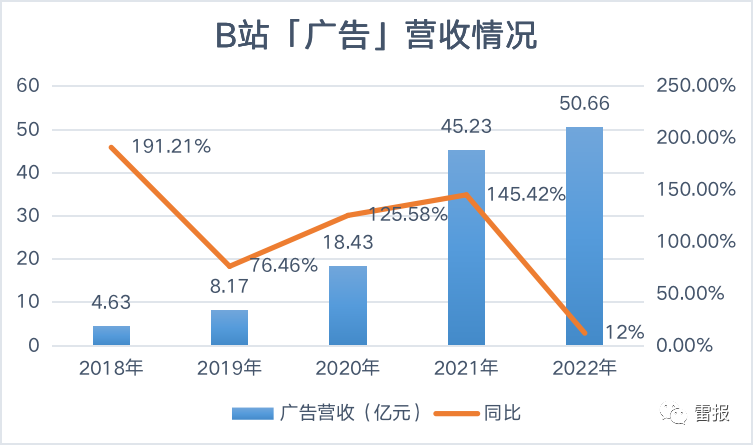 广告业务方面,2022年B站实现同比增长12%,营收约51亿元。财报指出主要是由于其品牌在中国线上广告市场得到进一步认可,以及B站的广告效率有所提高所致。