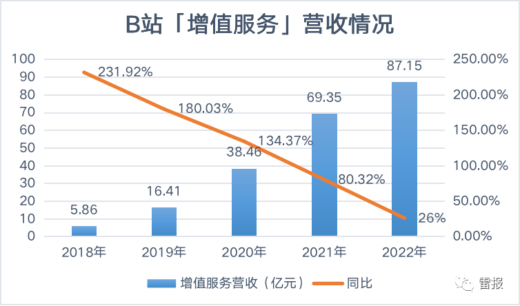2018-2022,B站增值服务营收增速逐渐放缓