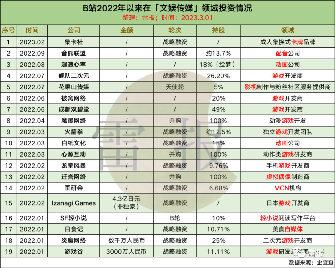 此外B站还投资了投资了知名配音演员谢添天、夏磊等的配音公司音熊联萌,持股约13.7%,此前,该公司2017年还曾获阅文千万级天使轮投资,目前阅文持股25.89%,为第二大股东。