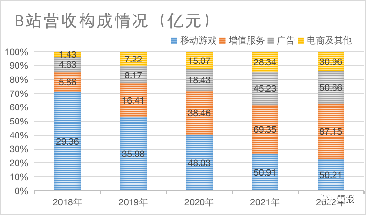 2022 B站广告营收超过游戏,增值服务贡献87亿,电商及其他仅同比增长9%