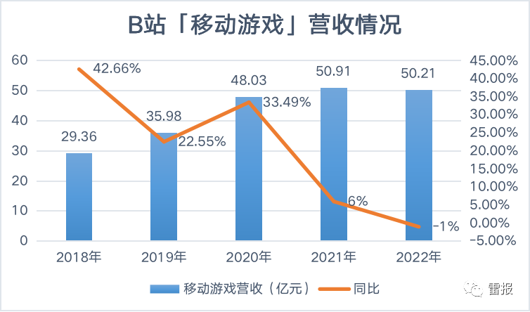 2018-2022:B站游戏营收缓慢增长,2021年仅同比增长6%,2022同比减少