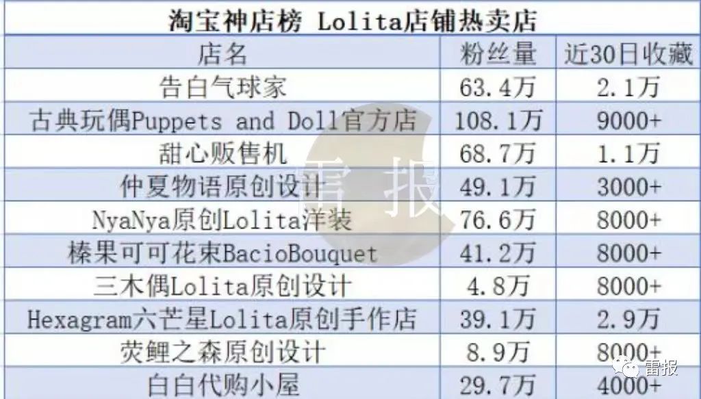 位列第一的告白气球店铺粉丝数累计达到63.4万,近30日收藏数为2.1万。告白气球家作为7年老店,主要售卖Lolita裙、jk制服、T恤、睡衣、包包等,“大耳狗 生日派对”为其销量第一的产品。