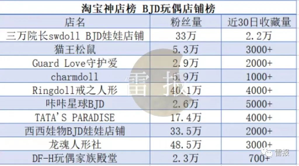 在淘宝神店榜的BJD玩偶店铺热卖榜,排第一的是三万院长swdoll BJD娃娃其粉丝订阅量达到33万近30日收藏量达2.2万,其中关仓囤单三万院长大力力自制BJD6分娃娃素体胖六身体成为店内销量第一。榜单其余店铺为猫王松鼠、Guard Love守护爱、charmdoll、Ringdoll戒之人形、咔咔星球 BJD、TATA'S PARADISE、西西娃屋、龙魂人形社、DF—H玩偶家族殿堂。