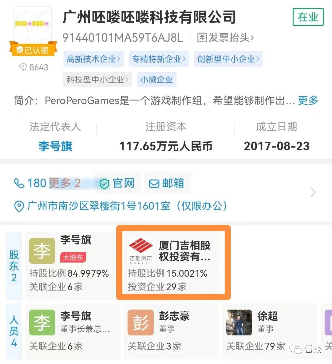 其中peropero小卖部是游戏Muse Dash衍生品制作官方店,隶属于广州斯哈斯哈科技有限公司,该公司由广州呸喽呸喽科技有限公司百分百控股,PeroPeroGames是其主要游戏制作组,厦门吉相股权投资有限公司持有约15%的股份。