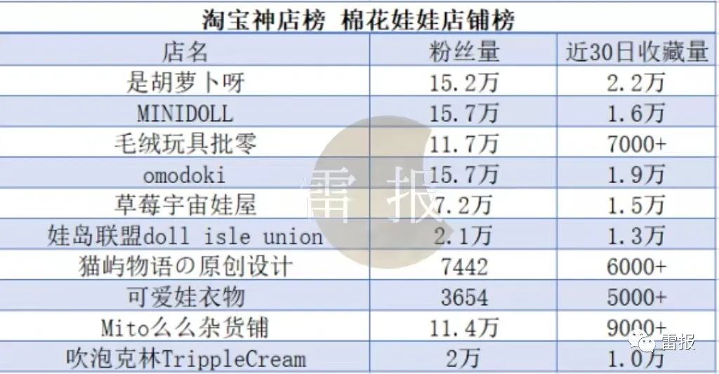 从淘宝神店榜-棉花娃娃店铺热卖榜来看,位于榜首的为是胡萝卜呀,该店铺的粉丝量为15.2万,近30日的收藏数为2.2万。榜单第二名和第三名分别为MINIDOLL和毛绒玩具批零。两家店铺的粉丝量分别为15.7万和11.7万,与上月相比MINIDOLL涨幅明显。