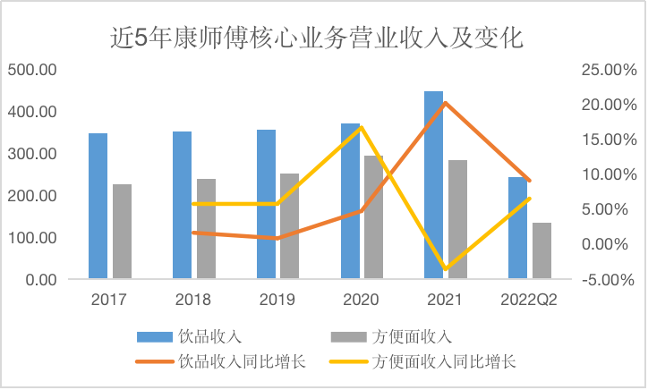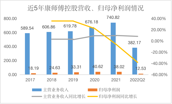 作为坐拥方便面、饮料两大板块的龙头公司,康师傅近几年的表现完全不符合预期。自2017年,康师傅控股的主营业务收入几乎没有变化,到2021年时仅仅增加了140亿元,复合年均增长率仅有5.88%。归母净利润上则表现得更加糟糕,5年里增速一直持续下滑,到了2021年时已经下滑至负增长(-6.40%)。2022年前半年更是只有12.53亿元,同比下滑接近40%。