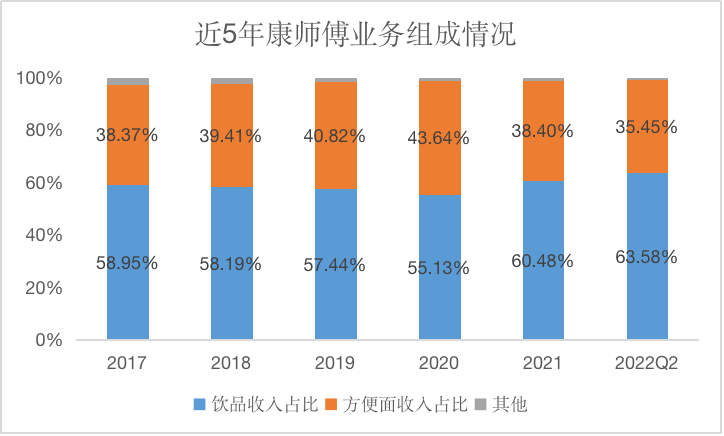 从细分业务上来看,康师傅最核心的两大业务分别是饮品和方便面。作为以方便面起家的企业,康师傅早年的方便面业务是企业的第一大核心业务,然而近些年随着市场的变化,康师傅的业务核心逐渐倾向了毛利率更高的饮品业务。到了2022年上半年,饮品业务已经占到了康师傅全部营收的63.58%,远超方便面业务的35.45%。