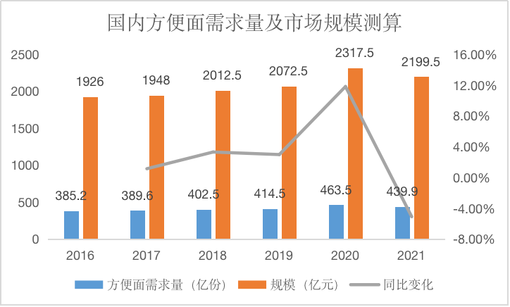 世界方便面协会统计的国内方便面需求量数据显示,按照5块钱一份的价格进行测算,全国方便面市场的规模大约在2000亿元上下小幅波动,仅仅在2020年疫情最严重的时候吃到了一波红利上涨。