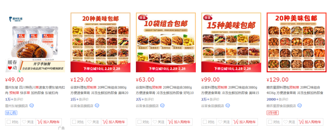 在某电商网站上搜索关键词“预制菜”,可以看到加热即食板块下综合前5的菜肴大多平均下来5、6元一份,甚至要比大多泡面更便宜。小壹哥就曾经购买过预制菜料理包备着,在家里不做饭的时候简单的热一下就可以食用,完成一桌简易的“四菜一汤”,这一点是方便面无法比拟的。