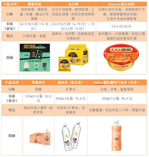 因此,为了改善自身“形象”,康师傅推出了一系列高端产品以赶上“潮流”。根据康师傅电商官方店的上架产品和网络公开信息统计,方便面推出了燃魂拌面、汤大师、速达面馆等等多个品类,饮品推出了黑糖奶茶、涵养泉、bubly微笑趣泡气泡水等等多品类。