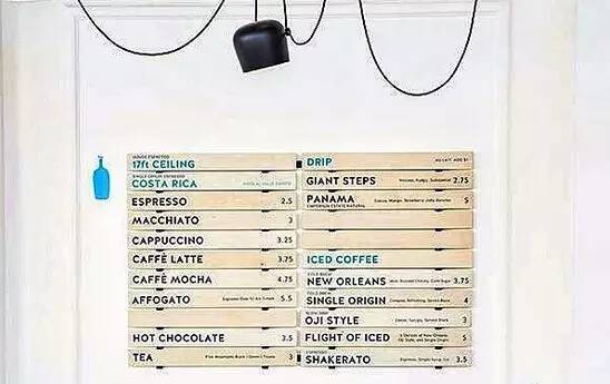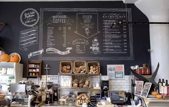 用黑板画出菜单,不少咖啡馆都在这样做,创造空间更多、也易于更新。值得一提的是,用涂鸦插画艺术字展现你的美术功底没有问题,但是产品名称与价格,请千万大写的清晰,好嘛?
