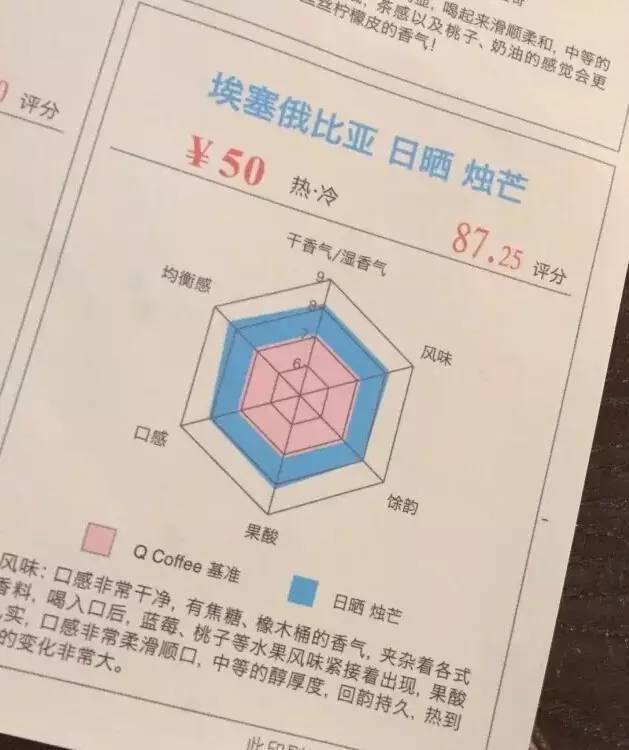 质馆咖啡上海新天地店的菜单,曾经一度成为大家讨论的话题(目前已更换)。不仅产品标注了由CQI评测的分数,甚至标有由口感、果酸、干湿香气和馀韵等指标建立的坐标系统,并用文字阐述其风味。