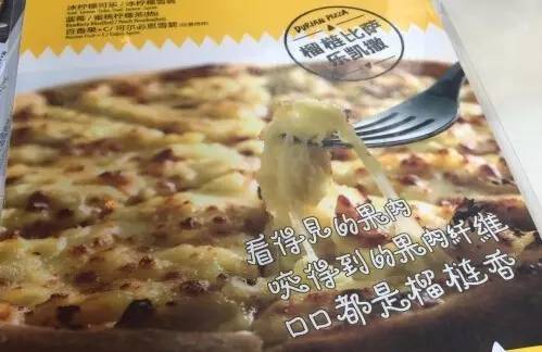乐凯撒披萨的菜单,在不复杂的折页中,处处可见强调榴莲披萨相关的讯息。