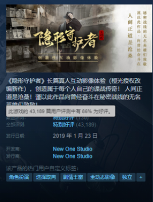 2019年年初的过年前夕,《隐形守护者》横空出世,它以“谍战“题材+“真人互动影游”的大胆搭配,赢得春节档的开门红,作为行业内“第一个吃螃蟹”的从业者,赚取了第一桶金。Steam平台超4万条评价,86%的特别好评,此成绩在这一领域属于标杆式的存在。