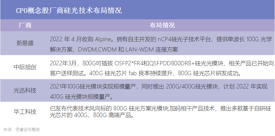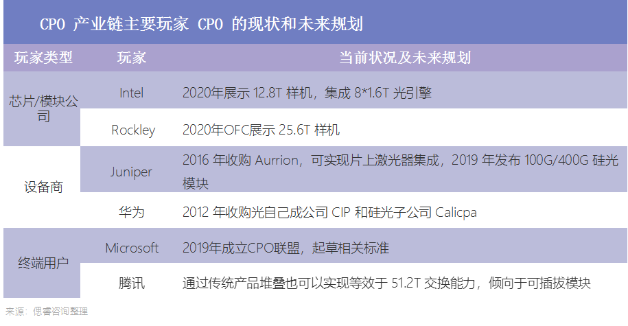 目前微软、Meta、谷歌等云计算巨头,思科、IBM、英特尔、英伟达、AMD、台积电等网络设备龙头及芯片龙头,均布局CPO相关技术及产品,并推进CPO标准化工作。