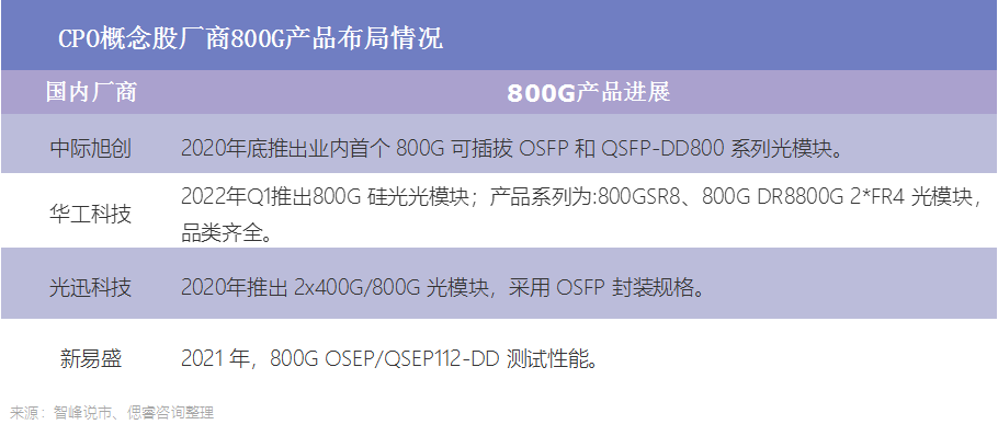 目前,国内主流光模块厂商均积极布局了800G产品。其中,中际旭创、华工科技和光迅科技的产品已经提供下游验证试用。
