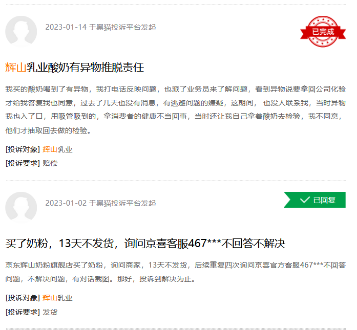 在黑猫投诉平台上搜索辉山乳业可以发现,不少消费者投诉辉山乳业产品中有异物、不发货、食品变质等问题。