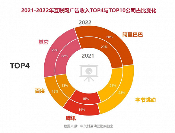 中关村互动营销实验室发布的《2022中国互联网广告数据报告》(下文简称“《报告》”)显示,阿里巴巴、字节跳动、腾讯、百度这四家企业,广告业务占比高达78%,而行业Top5-10企业则分别是京东、美团、快手、小米、拼多多和微博。