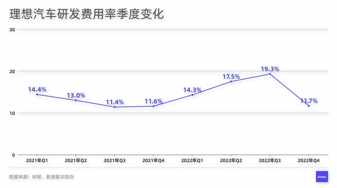 四季度,理想的销售、一般及行政费用合计16.3亿,同比增长44%,与之对比,研发费用20.7亿,同比增长68%。理想的研发费用率11.7%,已经算是很低的水平,销售+管理费用率则首次跌破了10%。