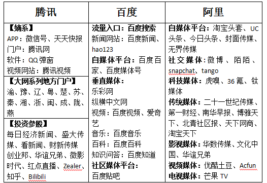 确实,作为中国IM霸主的腾讯如今以微信朋友圈,在移动互联网中占据的绝对的媒体优势!而百度作为搜索引擎老大,虽然在移动互联网中受到前所未有的冲击,PC端的流量霸主余威尚存。并且阿里所投资的媒体公司,许多是以联盟合作的形式,而未实现股权控制。以微博为例,虽然在9月12日阿里增持微博股权达到31.5%,但微博还不是阿里旗下的一员。