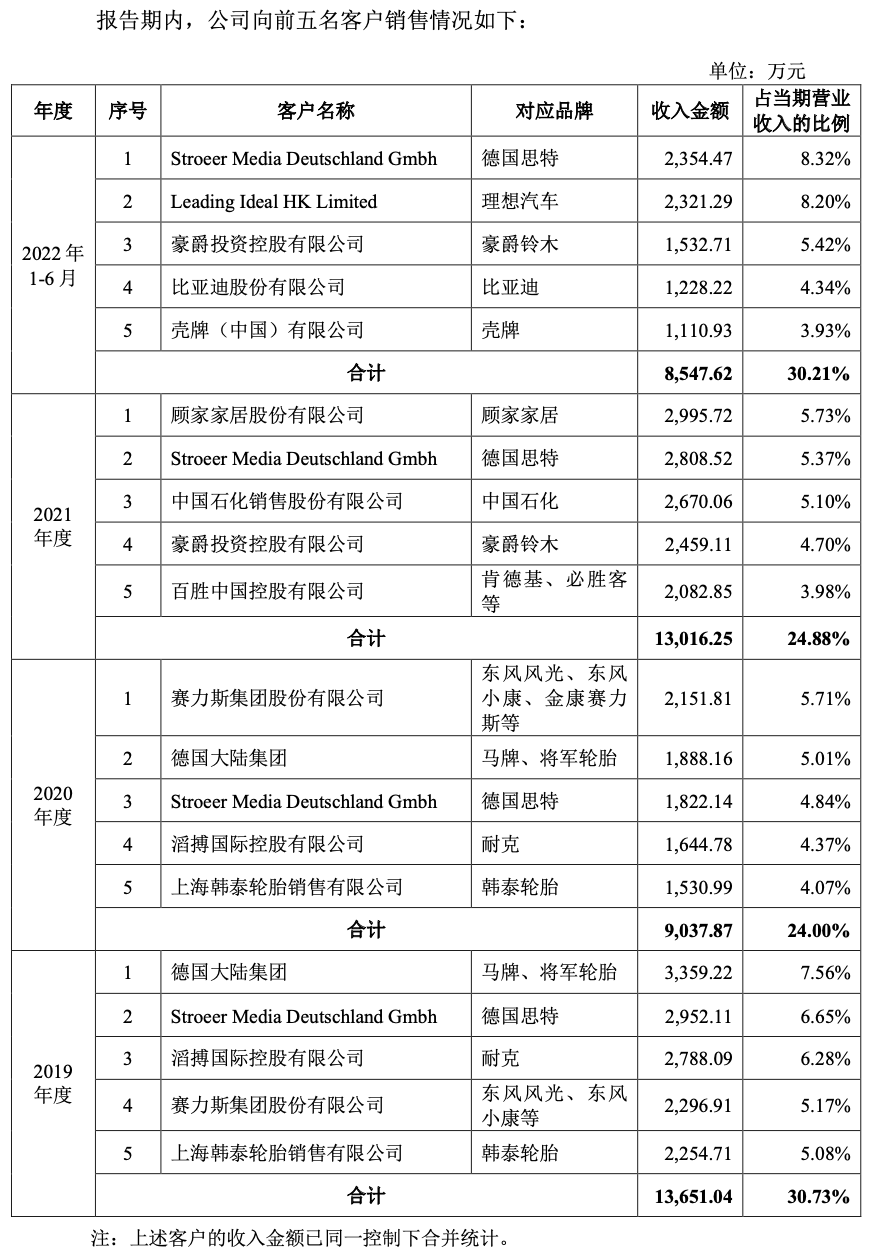 具体来看,公司主要以终端形象展示产品销售业务为主,报告期内实现收入分别为4.27亿元、3.49亿元、4.62亿元和2.32亿元,占比分别为96.23%、92.89%、89.17%和83.17%,其中前五大客户相对稳定,但集中度并不太高。