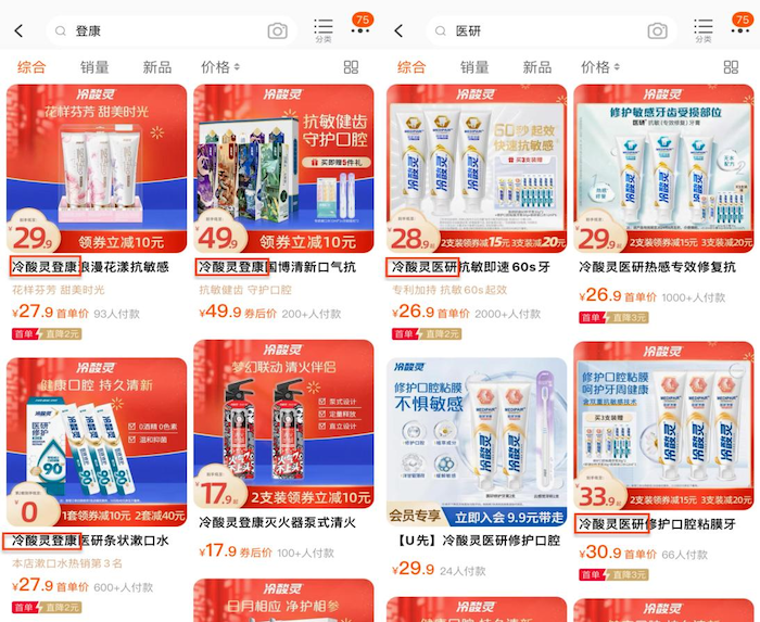而“登康”、“贝乐乐”等公司其余品牌仍依靠“冷酸灵”来获客。冷酸灵官方旗舰店售卖的产品中,“贝乐乐”、“医研”等牙膏品牌的前面都被加上了“冷酸灵”三个字