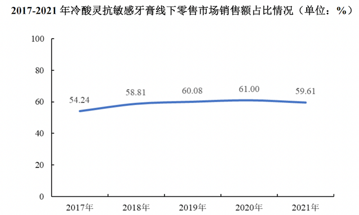 根据尼尔森零售研究数据,冷酸灵品牌牙刷2021年线下市场零售额市场份额占比为4.25%,2017年-2021年“冷酸灵”品牌在抗敏感牙膏细分领域线下零售市场销售额占比一直稳定在60%左右,但近两年出现下滑。