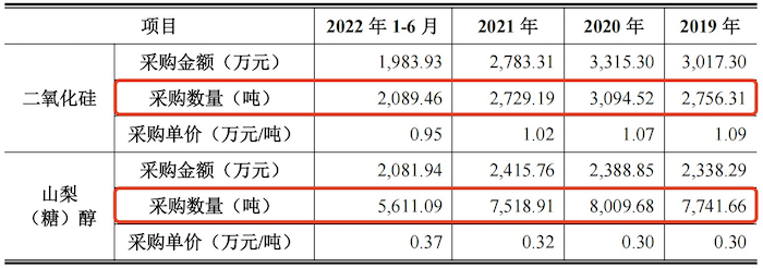 值得注意的是,2021年,登康口腔二氧化硅和山梨(糖)醇的采购数量却双双出现了下滑,下滑比例分别为11.81%和6.13%,但公司对此并未给出解释。