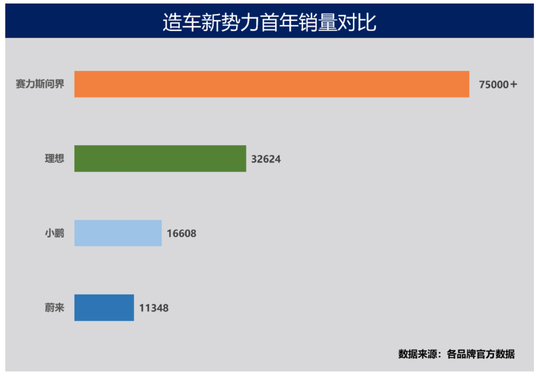 而据《财经故事荟》查阅,蔚来在2018年开启交付全年销量为11348辆,2019年小鹏首年交付16608辆,而理想第一年交付量则是32624辆。赛力斯问界系列首年销量,已超过“蔚小理”首年销量总和。