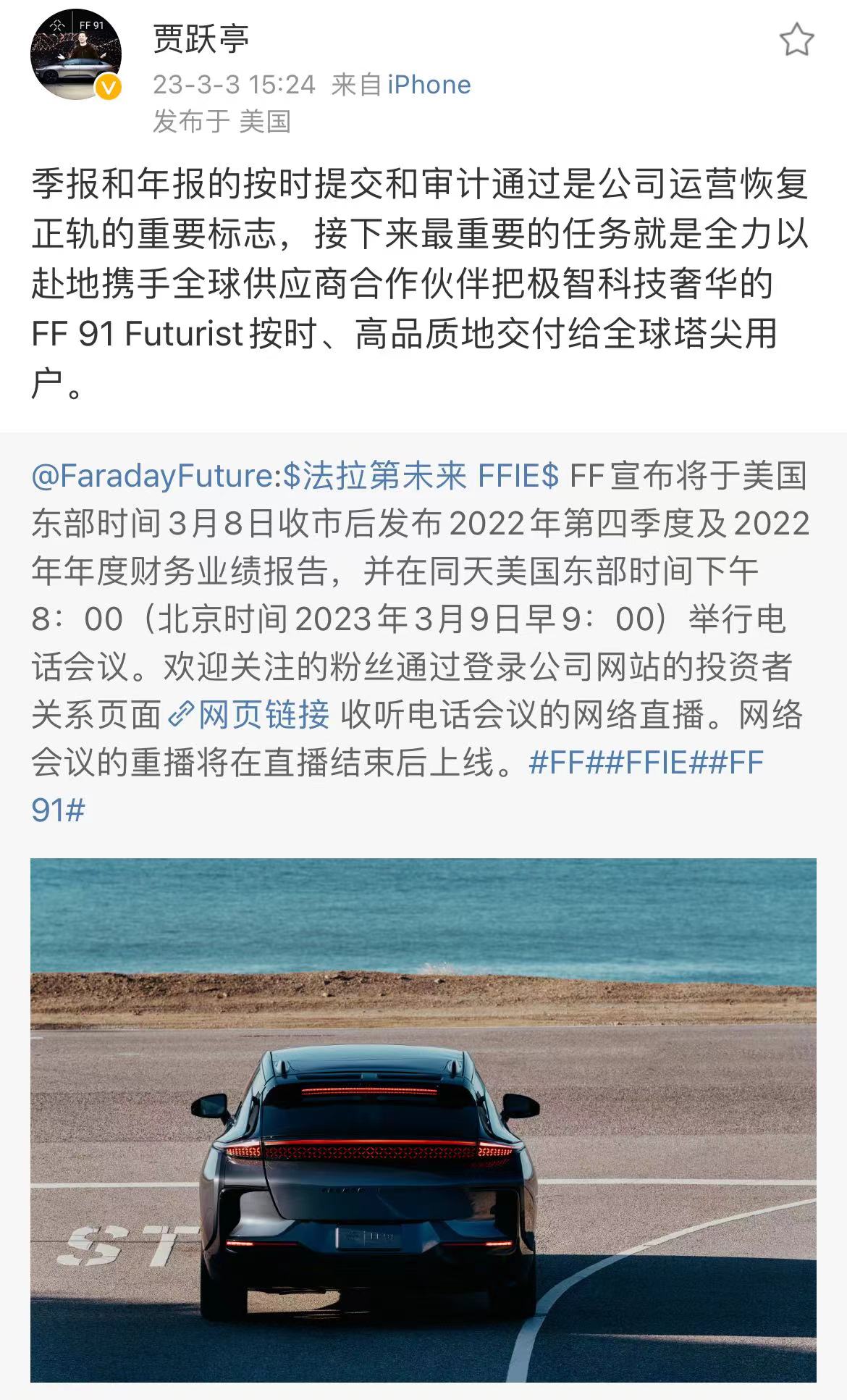 3月3日,法拉第未来(Faraday Future)宣布将于美国东部时间3月8日收市后发布2022年第四季度及2022年年度财务业绩报告。对此,法拉第未来执行官贾跃亭表示,季报和年报的按时提交和审计通过是公司运营恢复正轨的重要标志,接下来最重要的任务就是把FF 91 Futurist按时交付给用户。
