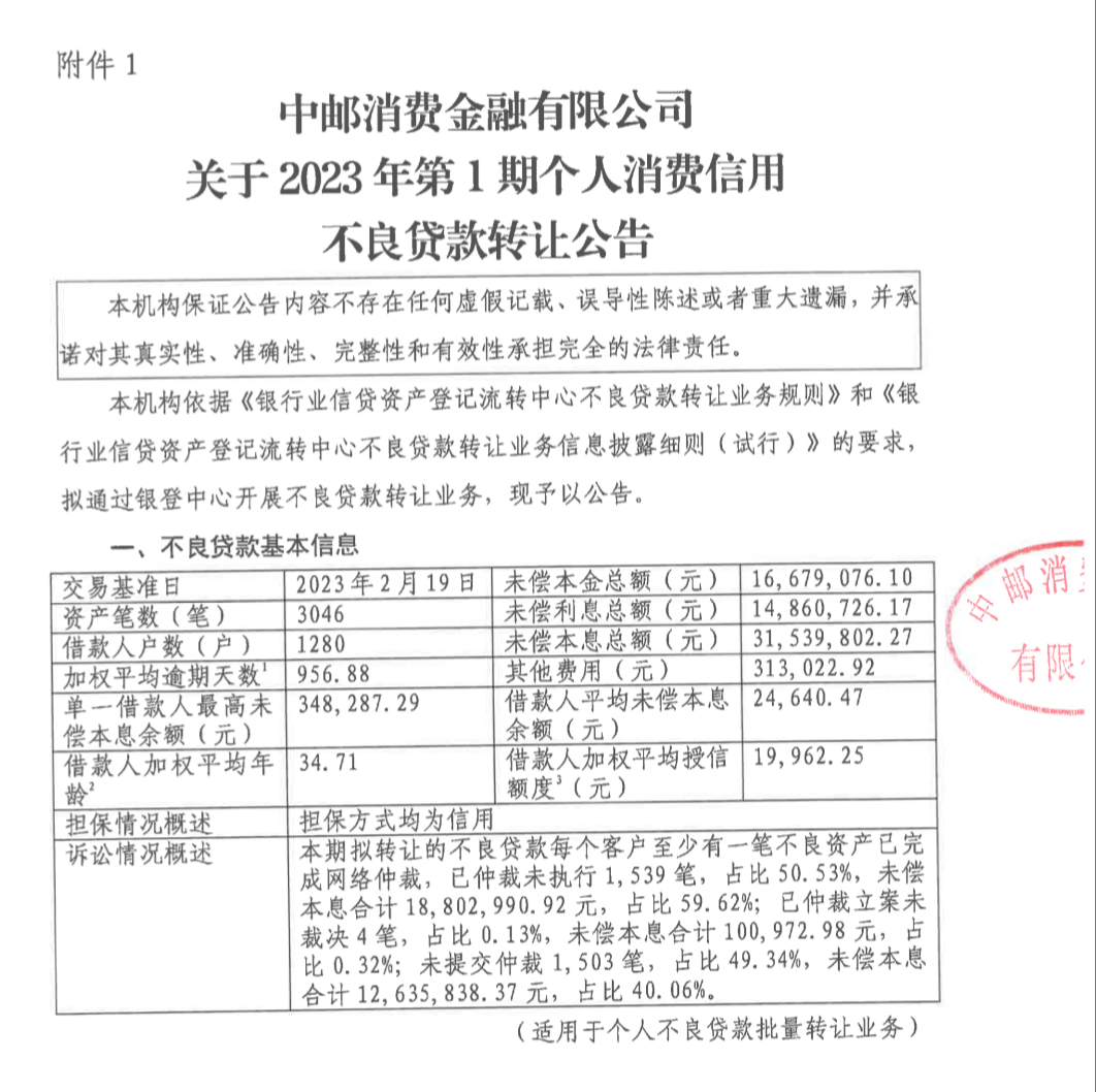 3月2日,中邮消费金融公司在银登中心网站发布《关于第1期个人消费信用不良贷款转让公告》,公告显示,中邮消费金融个贷不良资产包共计1280户3046笔个贷不良债权,本金1668万元,本息合计3154万元,,加权平均逾期天数956.88天,担保方式均为信用。