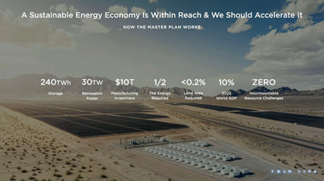 取而代之的,则是特斯拉CEO埃隆·马斯克对于特斯拉、以及地球未来的展望,也就是所谓的宏图第三篇章——让地球走向完全可持续能源之路。