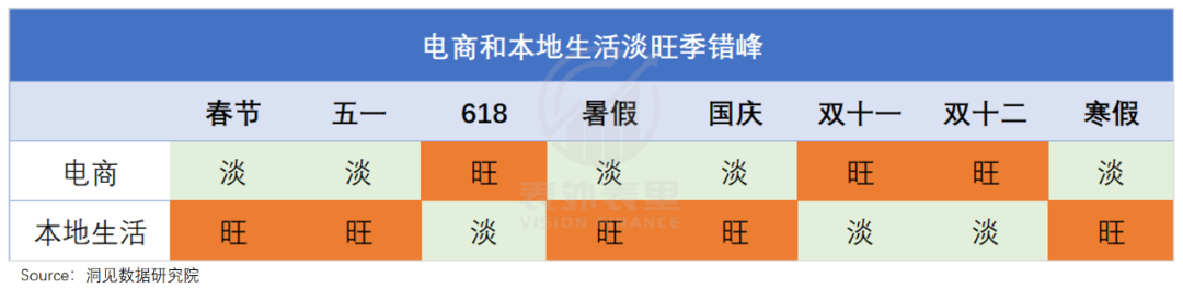 可见,本地生活和电商的淡旺季是错峰的,前者的旺季在寒暑假和节假日,后者的旺季则在618大促以及第四季度。