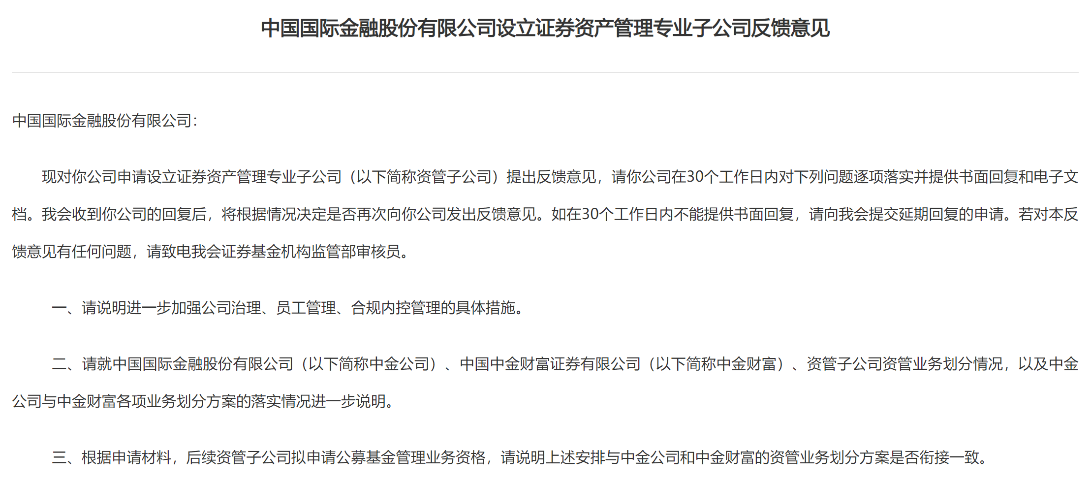 紧接着2022年6月,证监会发布公告,对中金公司设立资产管理子公司申请文件提出反馈意见,提出6个问题对中金资管进行“拷问”,涉及公司发展规划、高管资格、业务衔接、风控等方面。