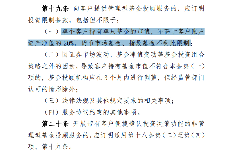 上述文件共有三章二十八条,包括明确基金投顾服务方式和内容、基金投顾服务相关费用、管理型基金投顾服务的内容、基金投顾机构及基金投顾人员禁止行为,以及争议处理措施情况和客户的权利义务等多项内容。