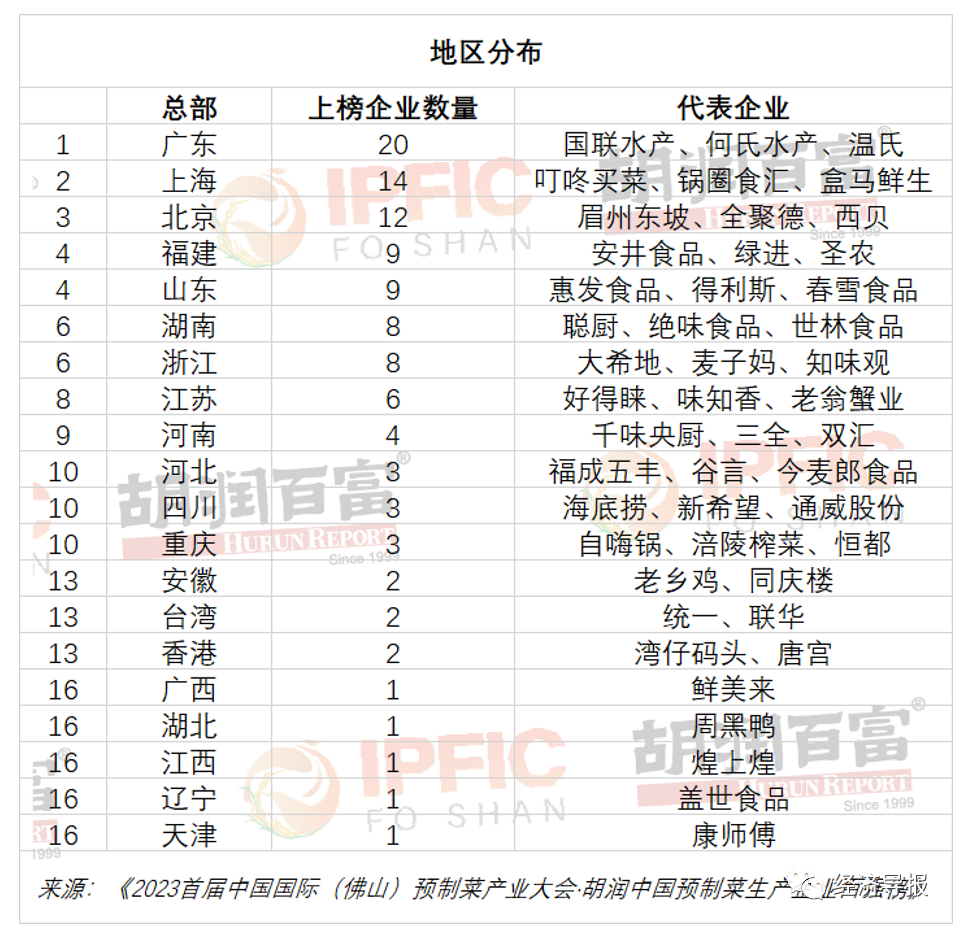 从整个榜单看,广东、上海、北京的上榜企业数量分居前三。胡润百富董事长兼首席调研官胡润说,“广东、上海、北京是上榜企业最多的三个地区,都有超过10家企业上榜。有趣的是,三地呈现出了各自的优势领域。比如,广东有多达11家企业主营农林牧渔,例如国联水产、温氏、何氏水产等等,因此广东预制菜的主要领域以即配为主;上海的上榜企业中,零售类企业是特色,全部四个零售类上榜企业中,有三个在上海;北京则以餐饮企业为主,如眉州东坡、西贝、全聚德等。”
