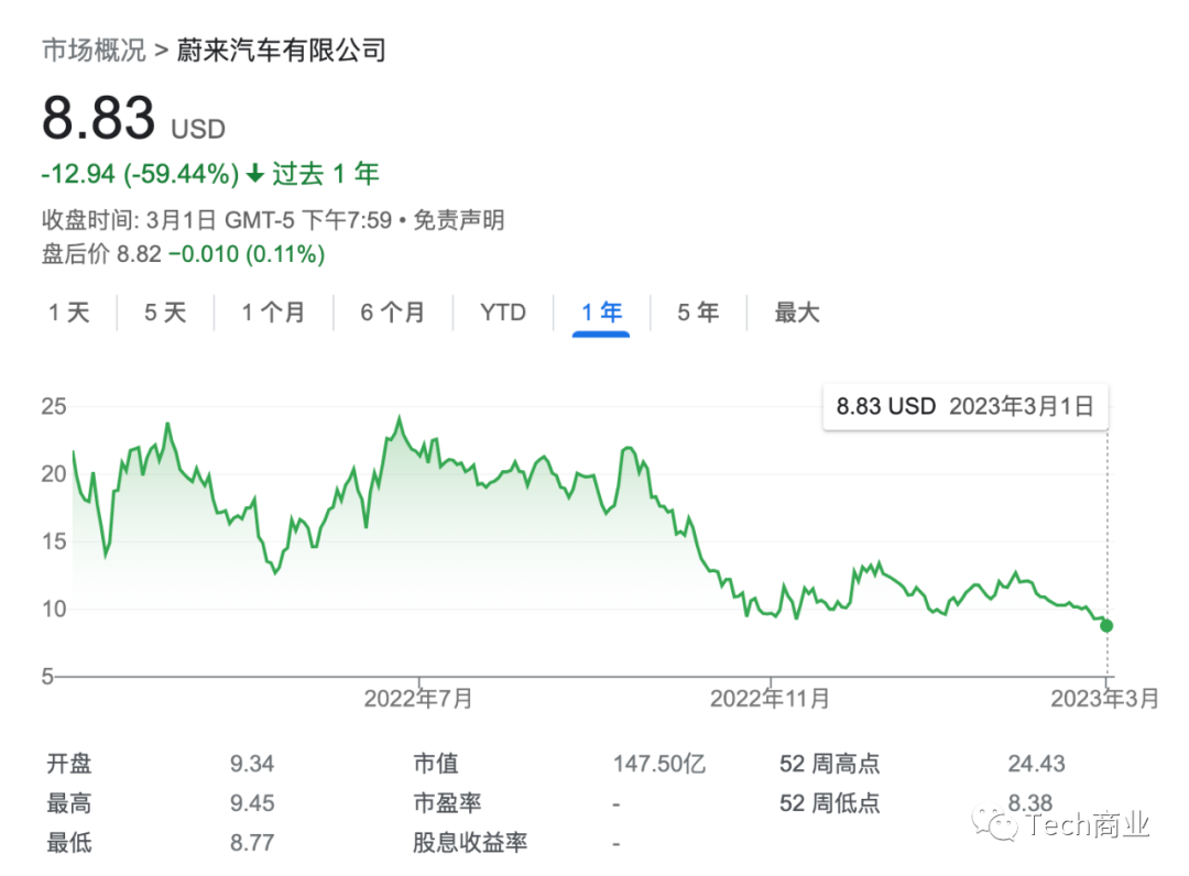 截至本文,蔚来过去一年股价下跌59%,当前市值为148亿美元。