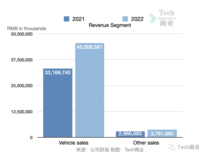 蔚来公司收入来自两分部业务,包括车辆销售、其他销售收入。其中车辆销售本财年收入为455亿元,同比上一财年同期的332亿元,本财年该项收入增幅为37%。其他销售收入为38亿元,同比2021财年时期的30亿元,表现为收入增长27%。