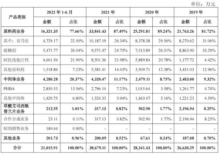 海森药业的主营业务为化学药品原料药及中间体的研发、生产和销售,2019年至2021年原料药业务收入占主营业务收入的比重均在80%以上,是海森药业主要收入来源。公司原料药主要为安乃近、硫糖铝和阿托伐他汀钙及其他。