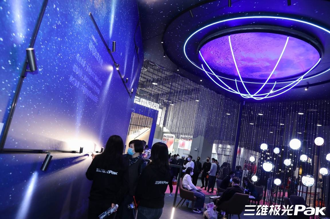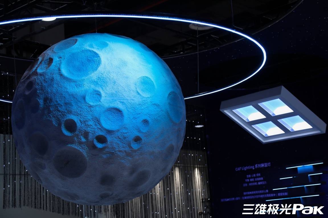 今年,三雄极光以“星辰大海”为设计主题,通过时尚大气的质感灯具与梦幻震撼的创意设计概念的无缝融合,构成一片沉浸式仰望星空的场地!一走近,巨大的星球造型给人震撼的视觉冲击,仿佛在浩瀚的宇宙中遨游。用“光”的不同展现方式呈现宇宙穿梭的主题,开启人类穿越星际太空的情境体验。