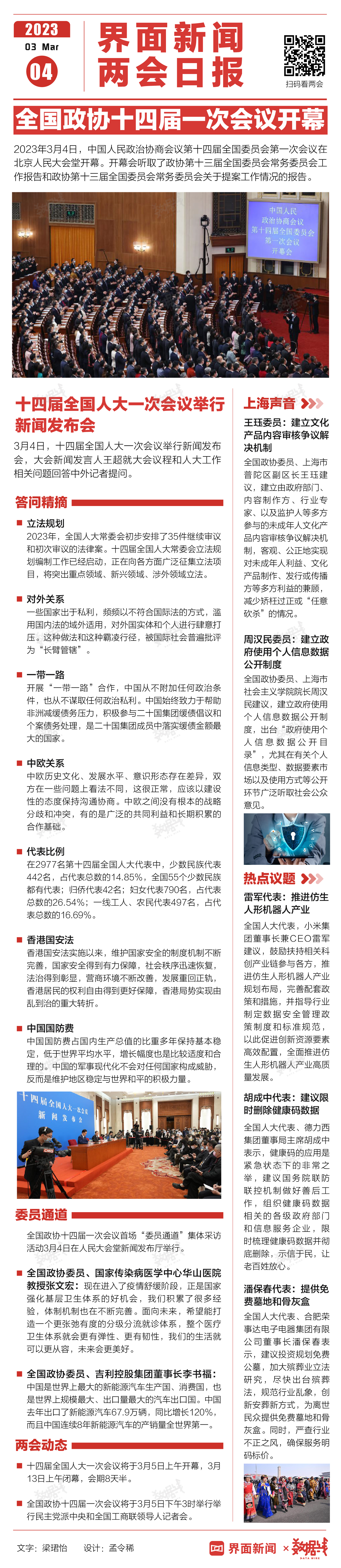 2023年3月4日,中国人民政治协商会议第十四届全国委员会第一次会议在北京人民大会堂开幕。