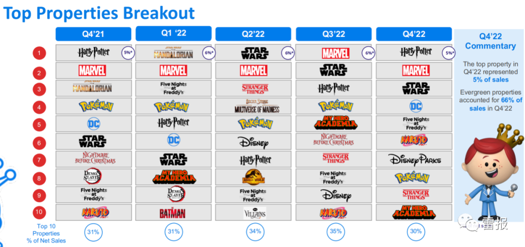2022Q4及前几季度Funko销售额TOP10的IP