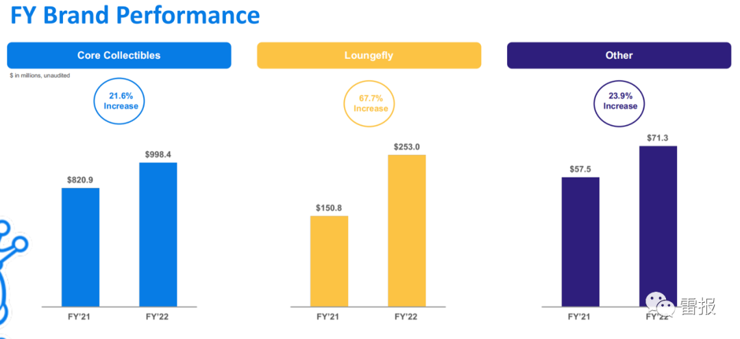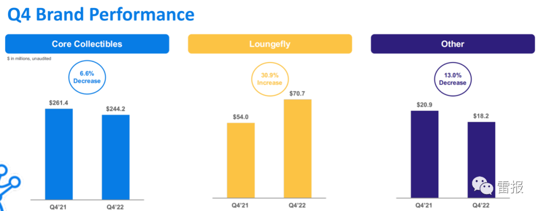 而三大部门中唯一实现增长的是潮流服饰部门Loungefly。Loungefly在Q4共卖出7070万美元,同比增长了30.9%。从2022全年来看,该部门也凭借67.7%的净销售额增长率领跑,而“核心收藏品”与“其他”部门则实现了20%左右的净销售额增长率。