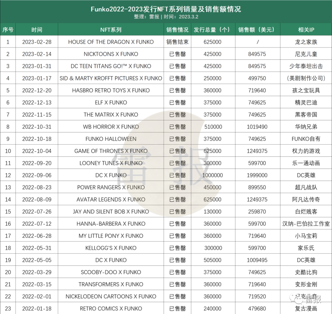 Funko的22全年NFT销售额达到1584万美元(约合人民币1.1亿元),其中总销售额在100万美元以上的产品共5款,包括两款DC英雄系列、阿凡达传奇系列、权力的游戏系列以及万圣街前推出的华纳兄弟恐怖角色系列。从发行数量与销售额来看,Funko更倾向于对影视相关IP的NFT系列设置更大数量的发行量。