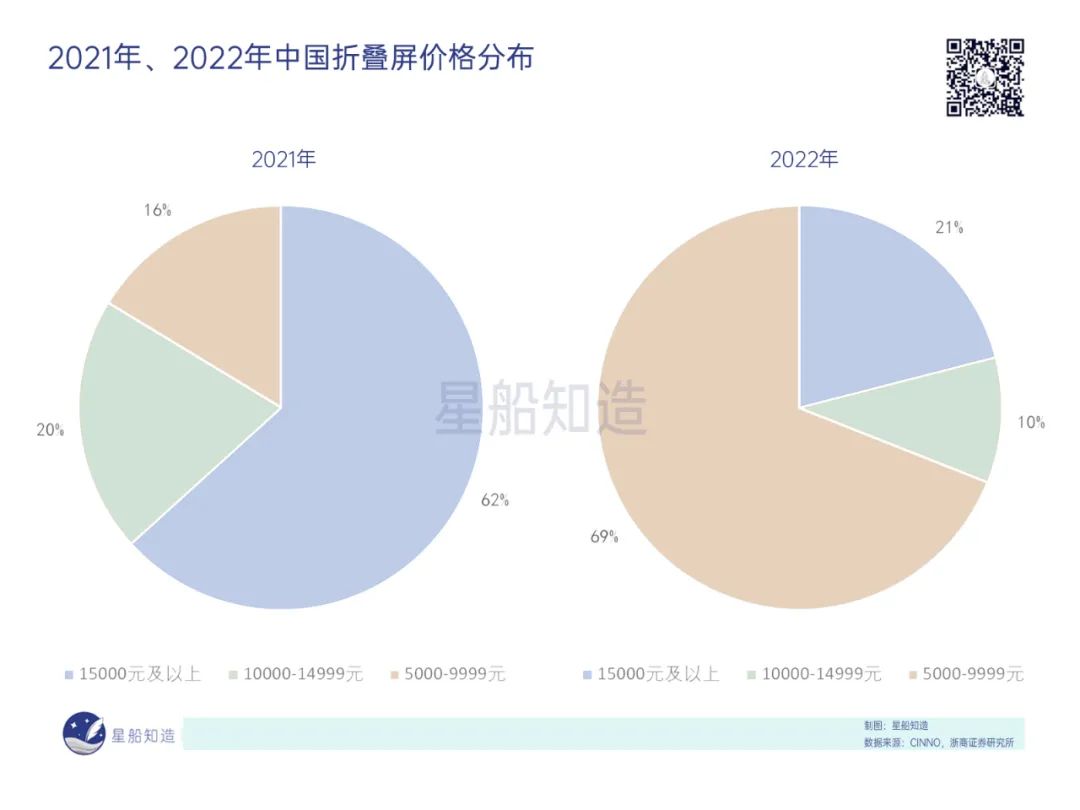 CINNO Research数据:2022年中国折叠屏手机市场中,1.5万元以上产品的销量占比从2021年62%下降至2022年的21%,1万元-1.49万元区间的产品销量占比则从20%降至10%