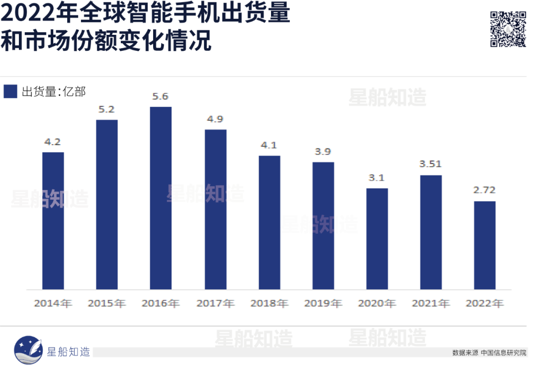 其次,2022年看着惨但也只是表象——早在2016年开始,包括中国在内的全球智能手机出货量就进入下降通道。2021年的反弹不过是昙花一现