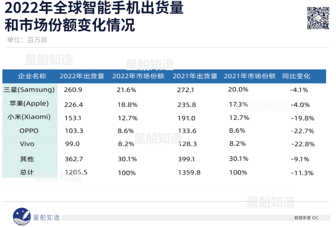 首先,数据是惨烈的:2022年全球智能手机出货量同比下降11%-12%,出货量创下自2013年以来最差表现。
