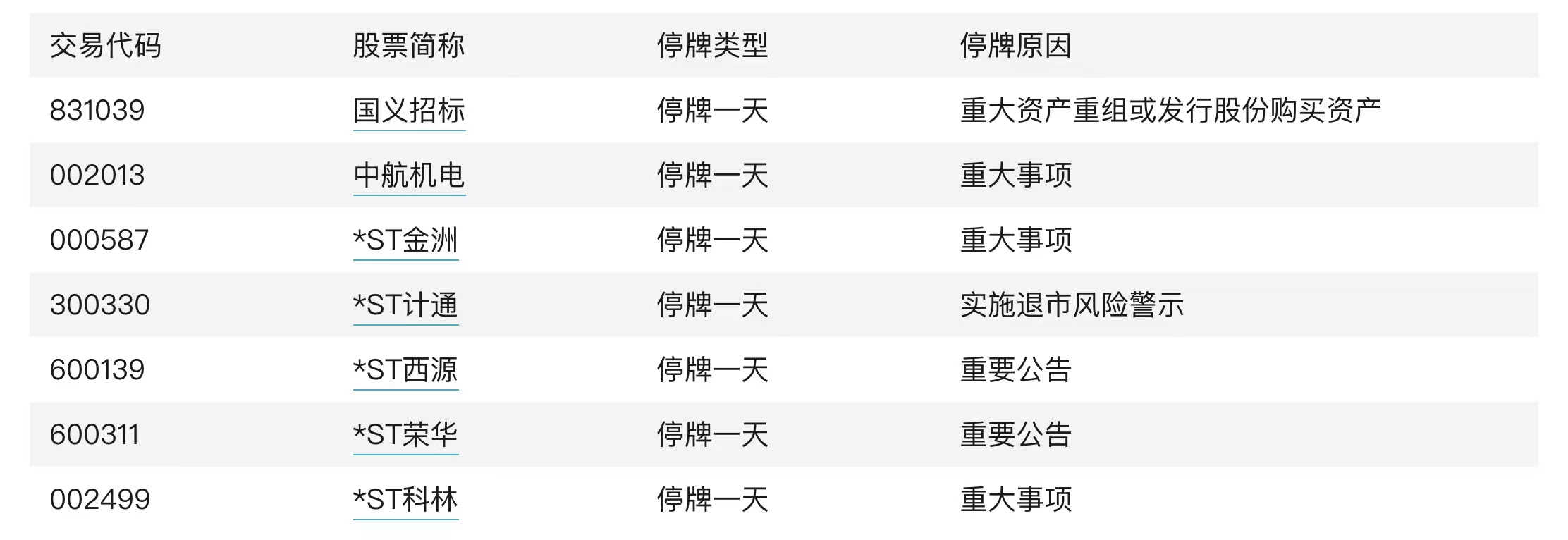 国义招标、中航机电、*ST金洲等7股今日停牌